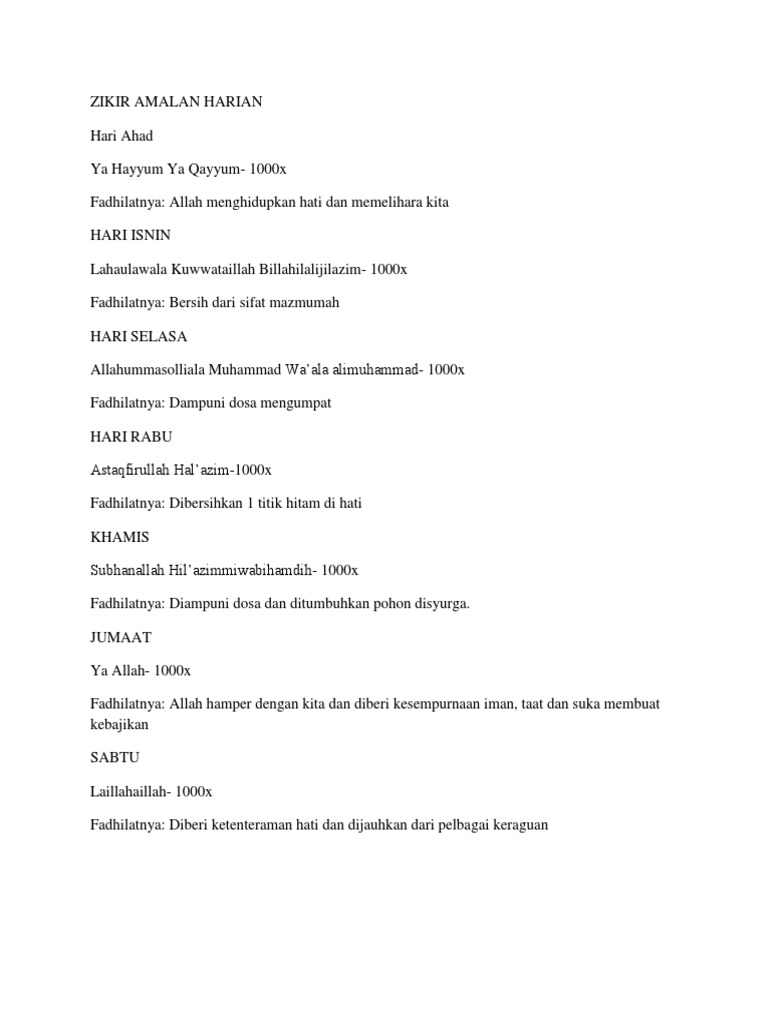 (wahai yang sentiasa hidup dan sentiasa kekal). Hari jumaat adalah hari yang paling afdal dalam seminggu. Dibaca 300x sehari atau dibaca 1000x sehari. Memperolehi harta yang banyak dan berkat semasa hidup kita. Hari selasa adalah hari berdarah.